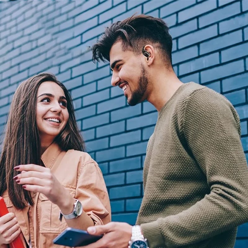 Snakk fritt med lokalbefolkningen eller partnere – hver ørepropp støtter interaktiv dialog slik at begge parter kan høre oversettelser i sanntid.