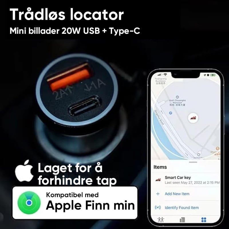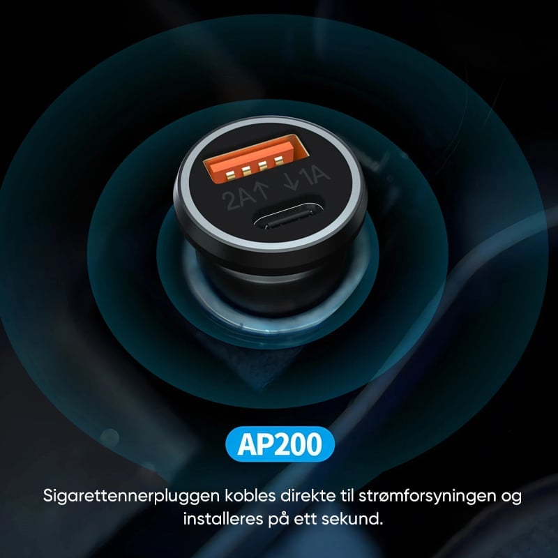 Si farvel til ladeforsinkelser og mistede biler med AP200 – en kraftig 2-i-1-billader og GPS-tracker designet for Apple-brukere!