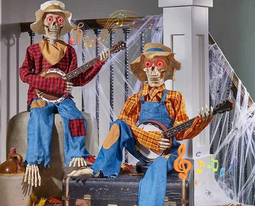 Vårt animatroniske skjelett kommer til live med bevegelse eller lydaktivering. Perfekt for hjemsøkte hus, Halloween-fester, klubber og temaparker – det tuller, spiller «Dueling Banjo»-musikk og beveger hodet synkront med melodien!